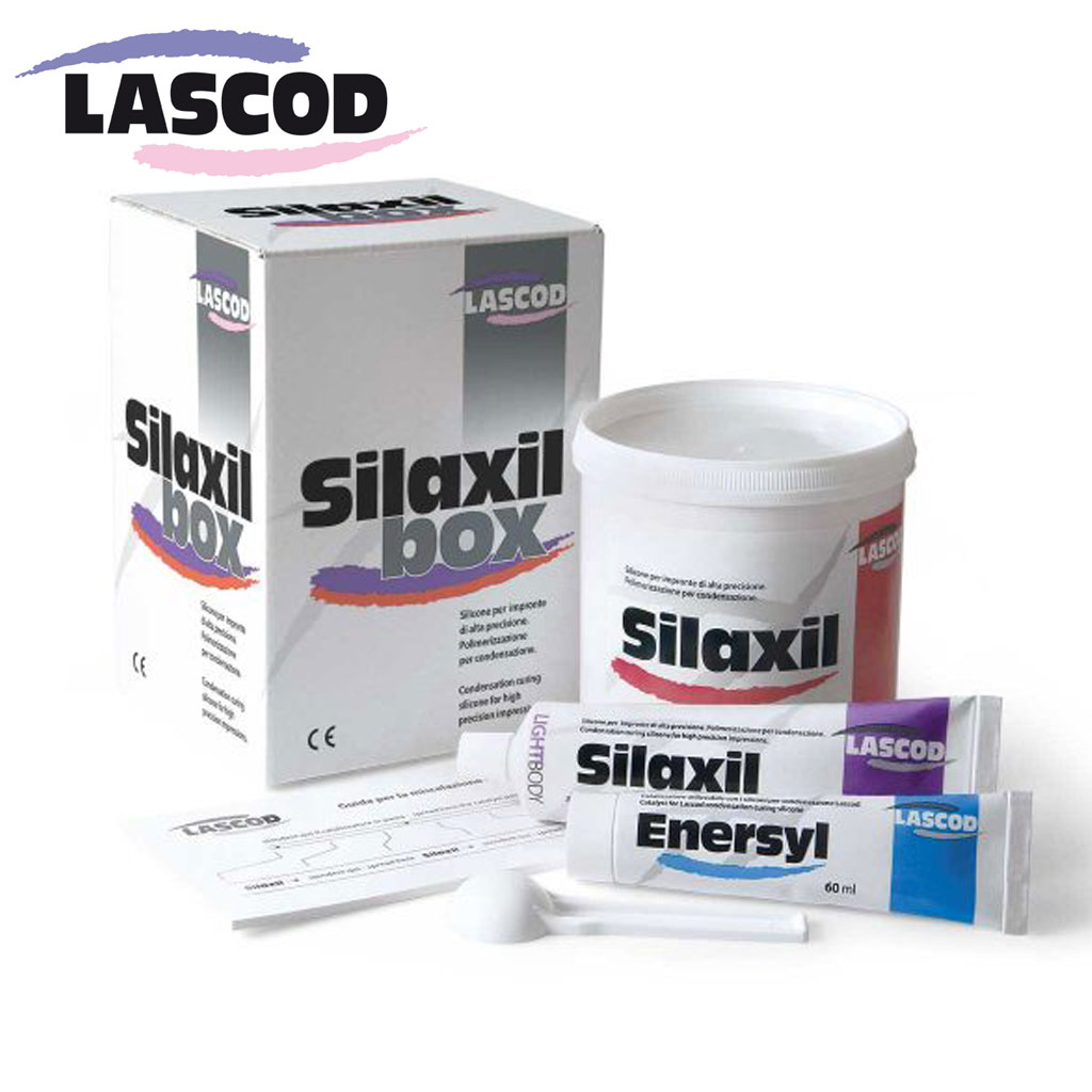 Lascod’s innovative Silaxil Silicone Kit represents the latest advancement in condensation silicone impression materials. This complete system includes Putty, Light Body, and Catalyst for versatile, accurate dental impressions.